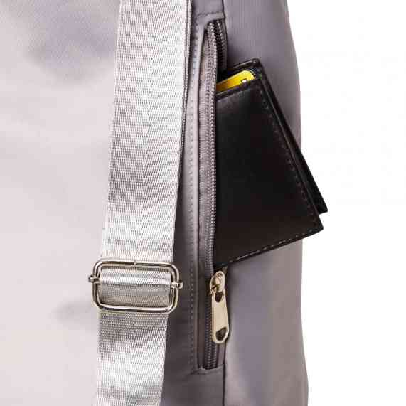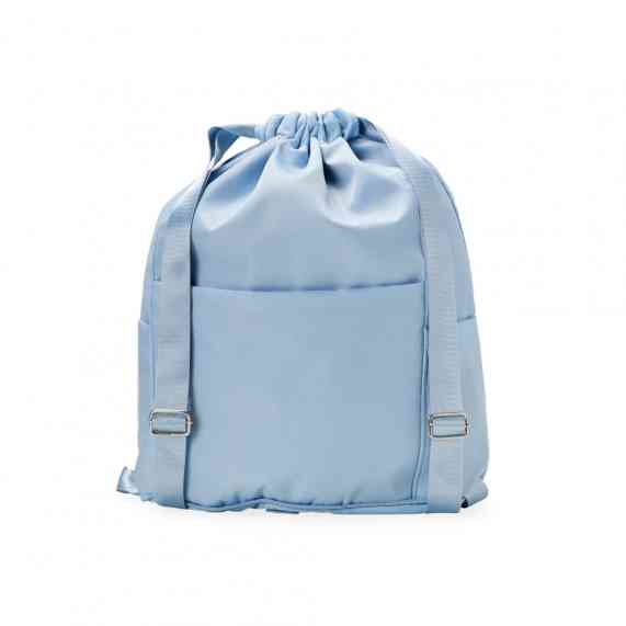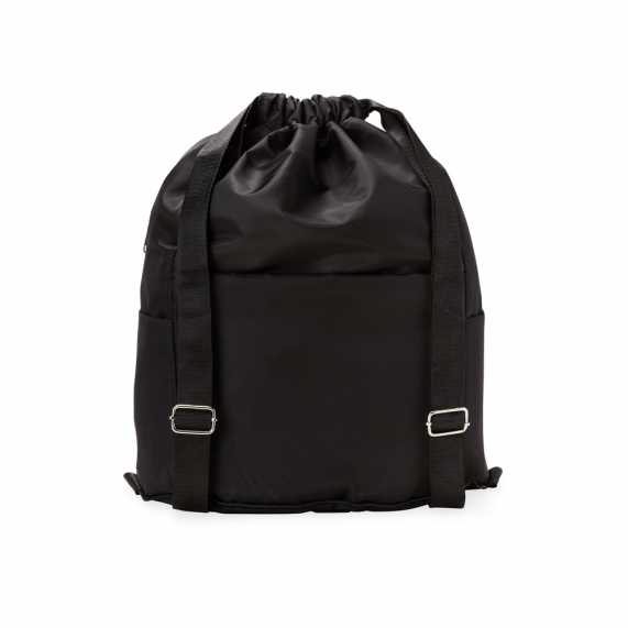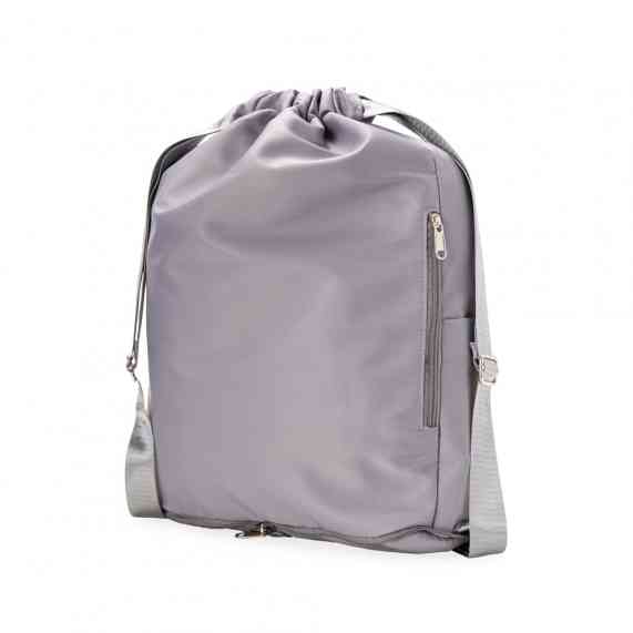 Mochila saco em poliéster de impacto impermeável com três compartimentos, sendo o principal com bolso interno exclusivo para itens molhados. A mochila possui um compartimento antifurto, bolsos laterais e alças reguláveis.