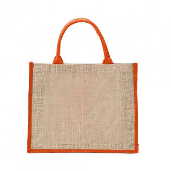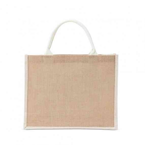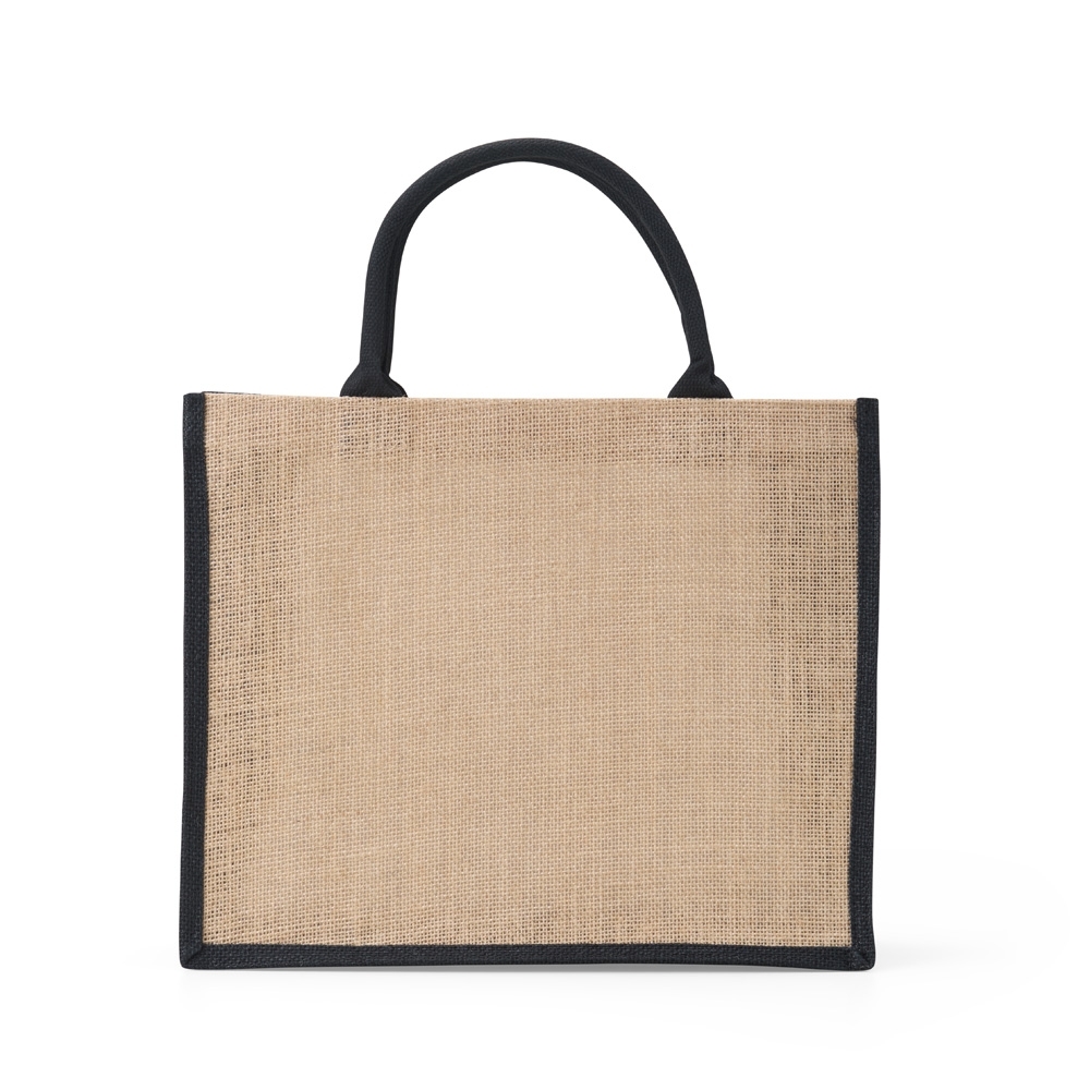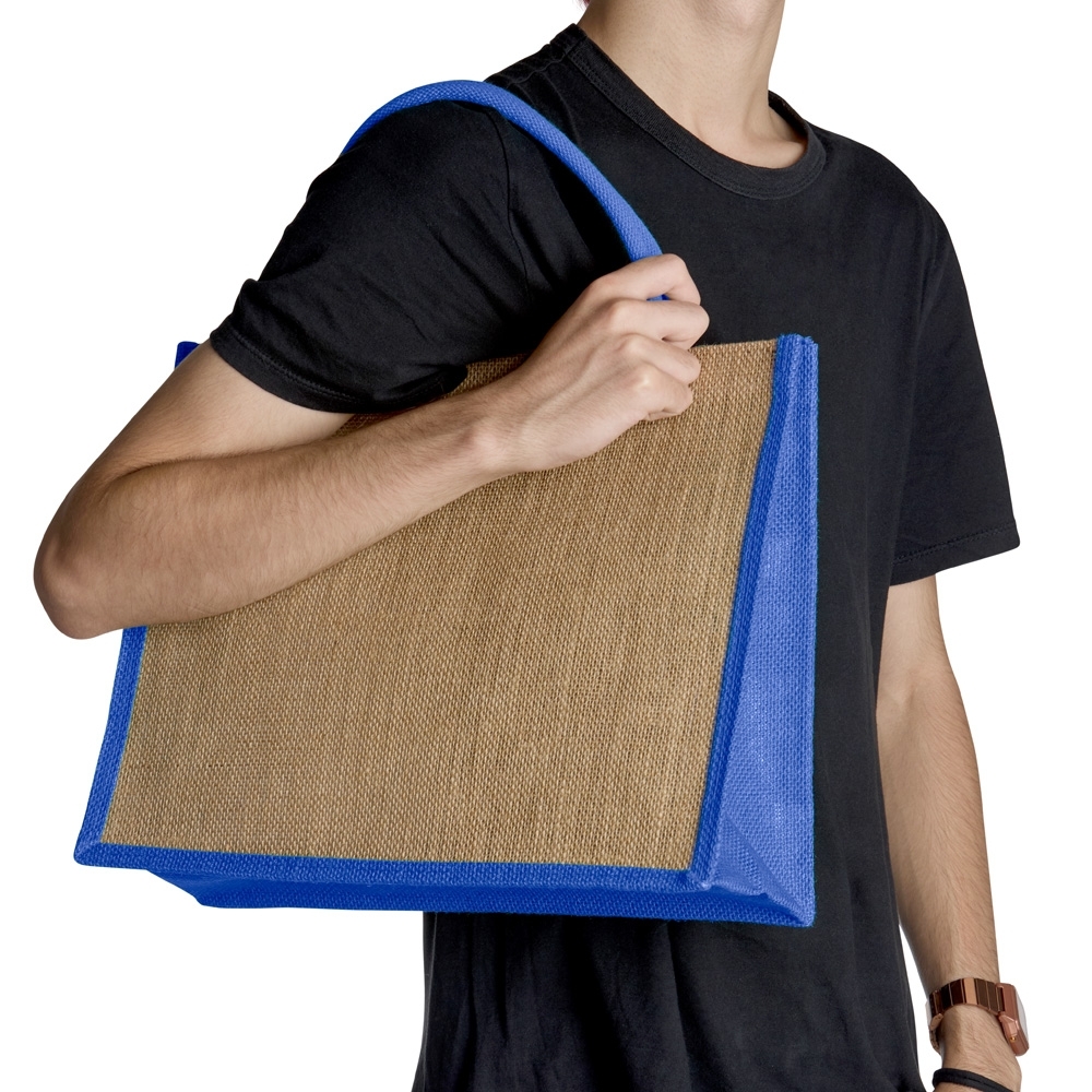 Sacola ecológica confeccionada em juta com alças costuradas na parte interna.