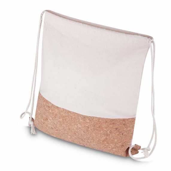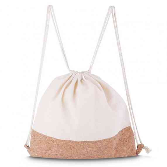 Bolsa em algodão cru com detalhe em cortiça, alça dupla para colocar nas costas.